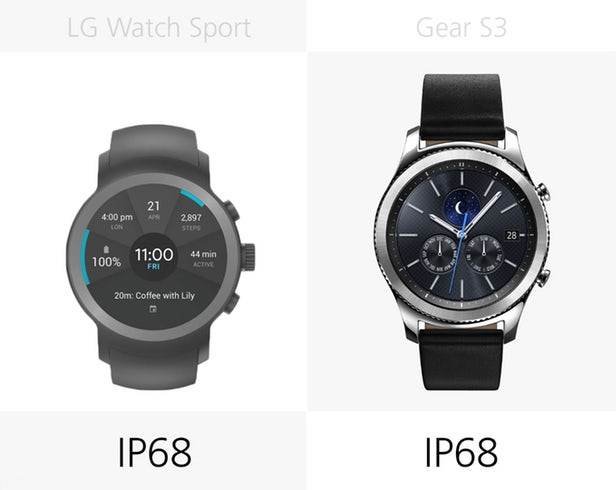 یکی از نقاط مشترک در مقایسه ال جی واچ اسپورت و سامسونگ گیر اس 3 ، قابلیت ضد آب بودن آنهاست. هر دو این ساعت های هوشمند دارای تاییدیه IP68 هستند. این بدان معناست که می‌توانند در عمق 1.5 متری آب و تا 30 دقیقه در برابر نفوذ آب مقاومت کنند. بدیهیست که شنا کردن همراه با این ساعت ها ایده خوبی نیست.