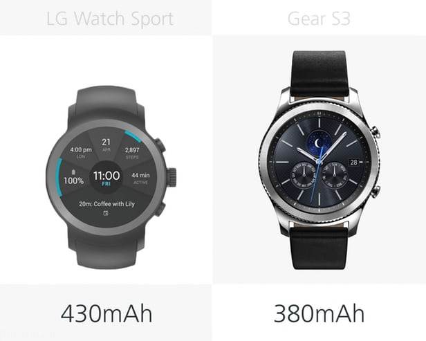 ساعت هوشمند ال جی از باتری بزرگ‌تری برخوردار است، اگر چه با توجه به پیکسل‌های بیشتر نمایشگر آن چنین چیزی منطقی است. ال جی واچ اسپورت از یک باتری 430 میلی‌آمپری استفاده می‌کند و یک باتری 380 میلی‌آمپری در ساعت گیر اس 3 تعبیه شده است. در آینده‌ای نزدیک بررسی کاملی از عمر باتری این دو ساعت منتشر خواهیم کرد.
