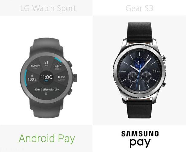 هر دو این ساعت‌ها به کاربرانشان امکان استفاده از سیستم های پرداختی موبایلی را می‌دهند. اگر چه سیستم سامسونگ پی این مزیت را دارد که بدون نیاز به حضور تجهیزات NFC در مغازه‌ها و تنها توسط کارت های اعتباری معمولی شما نیز می‌تواند، پرداخت توسط ساعت هوشمندتان را به ارمغان خواهد آورد. لازم به ذکر است که ال جی واچ اسپورت مجهز به سیستم پرداختی اندروید پی است.