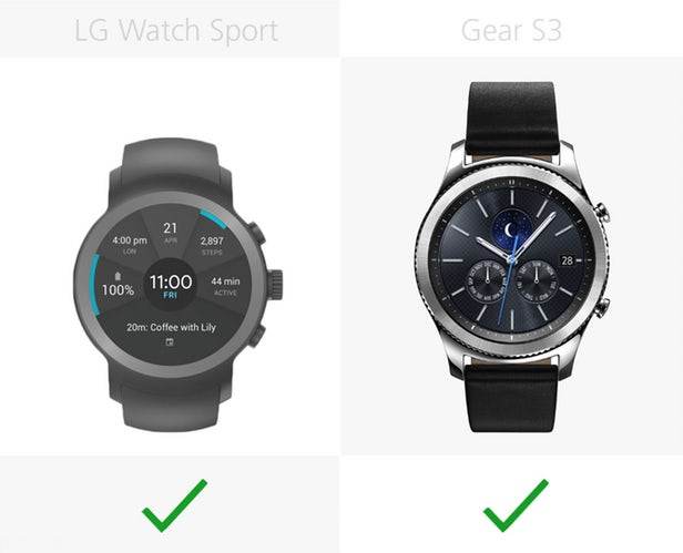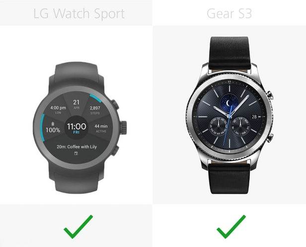 پرچمدار ساعت های هوشمند اندروید ویر 2، ال جی واچ اسپورت از نمایشگر P-OLED یا همان اولد پلاستیک بهره می‌برد؛ این درحالیست که گیر اس 3 از یک پنل آمولد برخوردار است.
