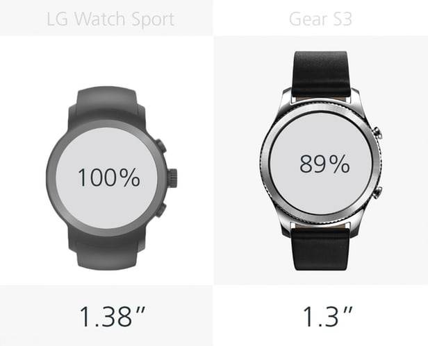 در حالی که هر دو این ساعت‌ها به خوبی بزرگ هستند، اما ال جی موفق شده در همان ابعاد از صفحه ساعت، نمایشگری حدودا 13 درصد بزرگ‌تر را به کار ببرد. اندازه نمایشگر ال جی واچ اسپورت 1.38 اینچ بوده و این درحالیست که گیر اس 3 سامسونگ از یک نمایشگر 1.3 اینچی بهره می‌برد.