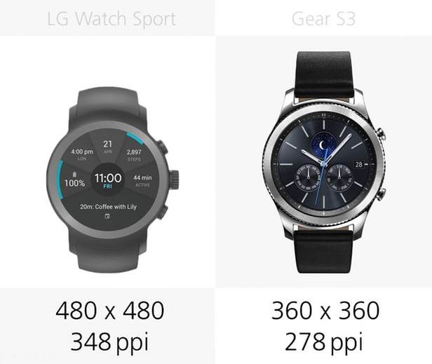 ال جی در ساعت واچ اسپورت از رزولوشن بسیار بهتری نسبت به تمامی ساعت های هوشمند عرضه شده در بازار استفاده کرده است. رزولوشن این ساعت 480×480 پیکسل و تراکم پیکسلی آن نیز 348ppi است. در آن سمت این مقایسه، نمایشگر ساعت گیر اس 3 از وضوح 360×360 پیکسلی همراه با تراکم 278ppi بهره می‌برد. گفتنیست که تراکم پیکسلی مدل ال جی 25 درصد بیشتر از نمایشگر گیر اس 3 است که می‌تواند شفافیت بیشتری را به ارمغان بیاورد.
